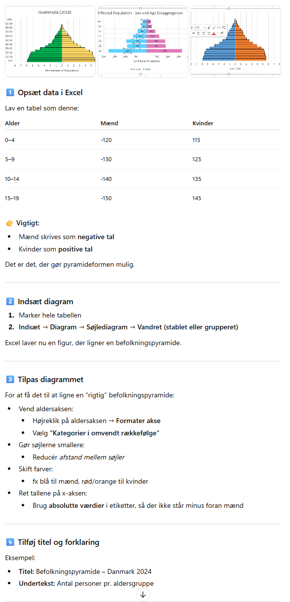 og dan en statistik med 10 års intervaller fordelt på køn og tegn den som en befolkningspyramide i Excel. Her er en vejledning.